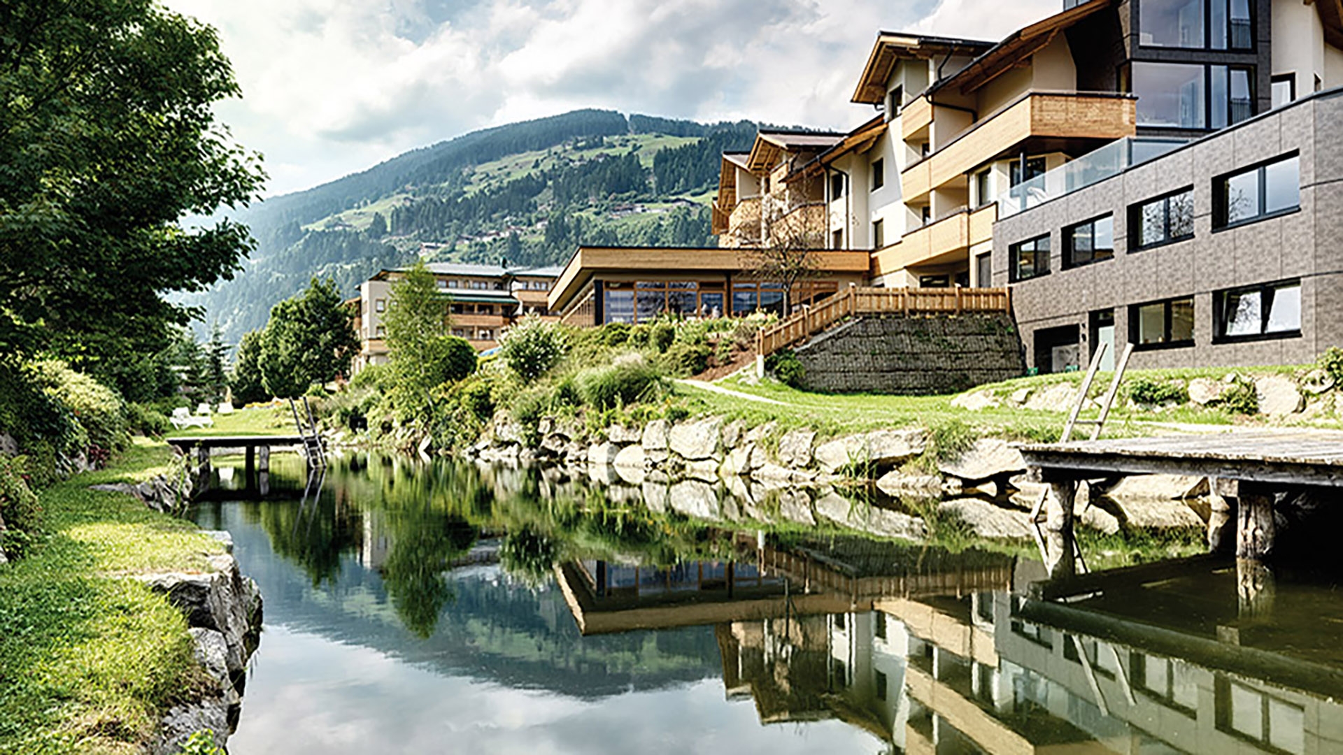 - Schwimmlandschaft mit Innen- und Außenbecken (inkl. Babybecken und Kinderbecken mit Rutschen), natürlicher Badeteich